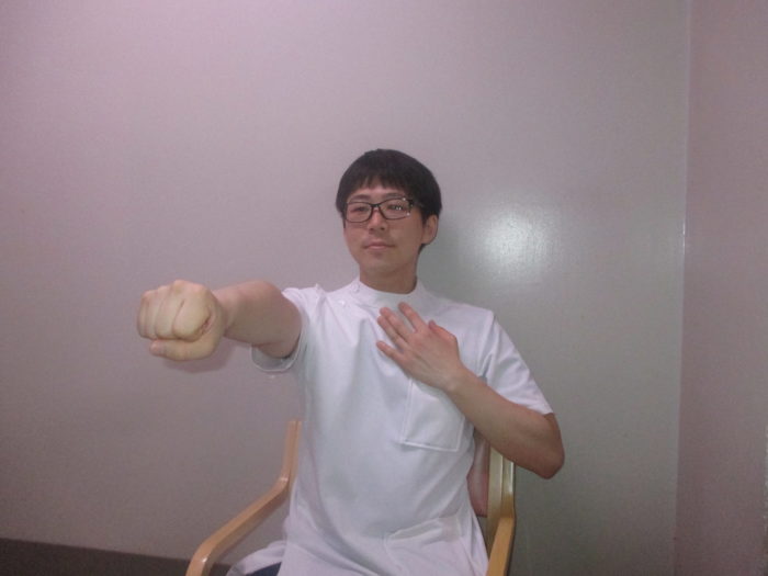 パターン1:突き出した手「パー」、胸の手「グー」